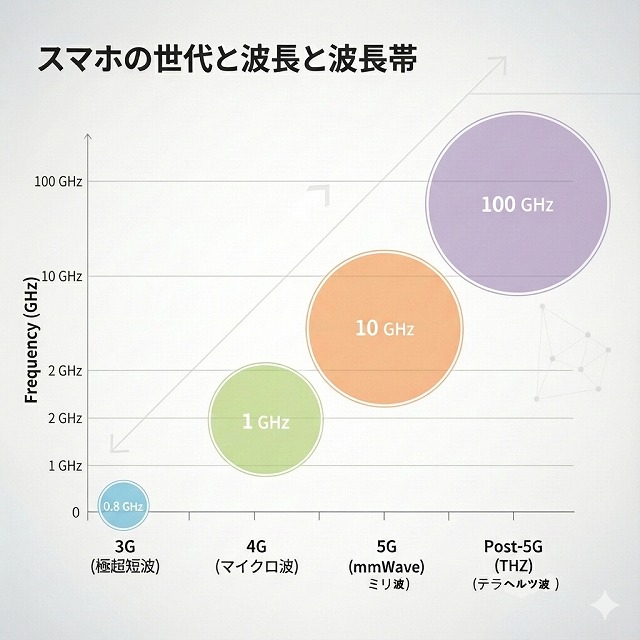 一方で、図を見るとわかりやすいのですがマイクロ波、ミリ波、テラ波はその帯域が広いため、多くのユーザーが使っても、帯域の広さで、通信スピードが保てます。高速接続ができるということです。各キャリアとも、これまでの3Gのプラチナバンドが使われなくなるため、この空いた波長帯を4G、5Gに転用して、遠距離通信もできる、4G、5Gとして活用していくことになります。