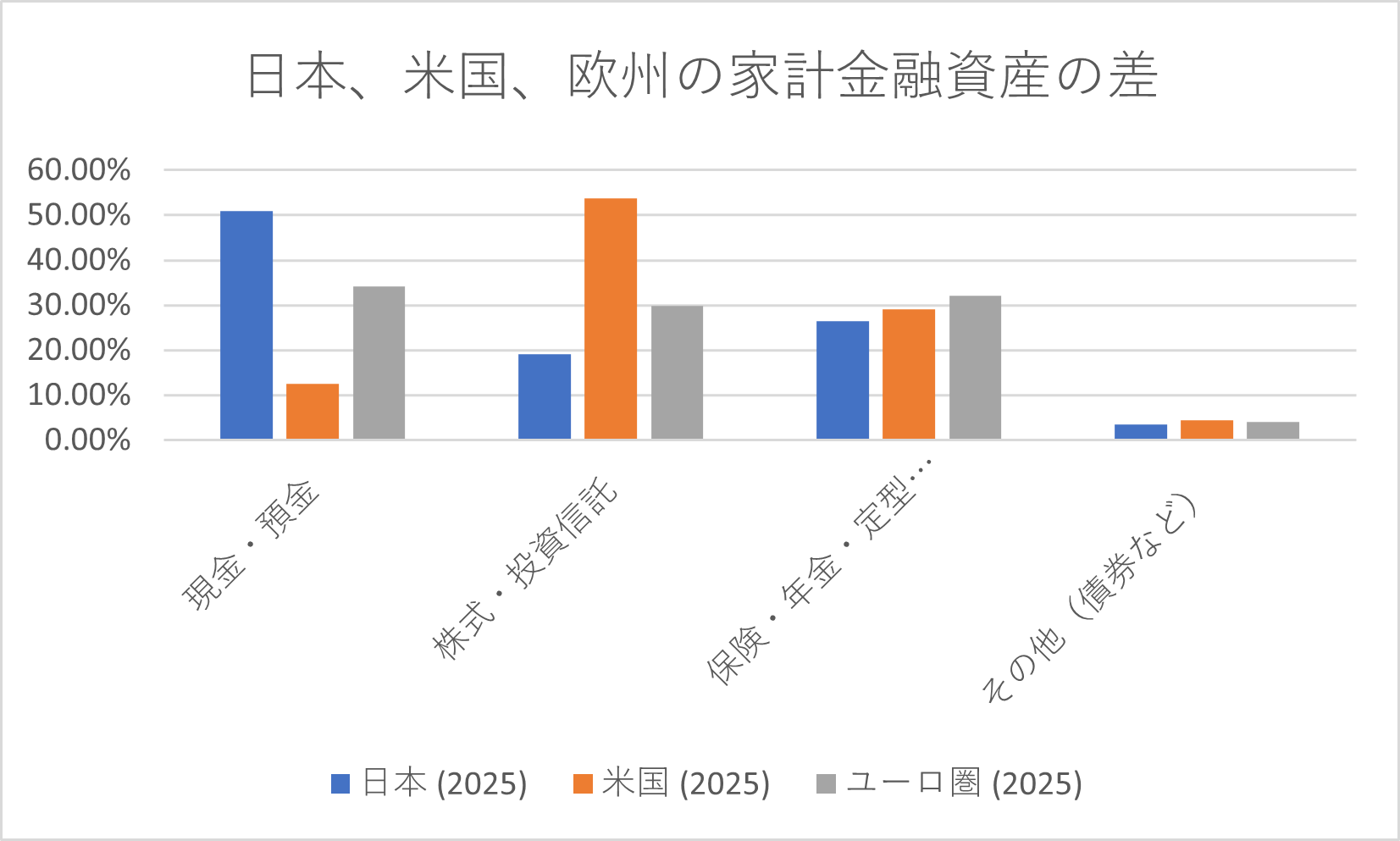 日本、米国、欧州(ユーロエリア)の家計金融資産の構成を比較すると、日本の「現金・預金」の比率の高さと、米国の「株式・投資信託」の比率の高さが非常に対照的です。